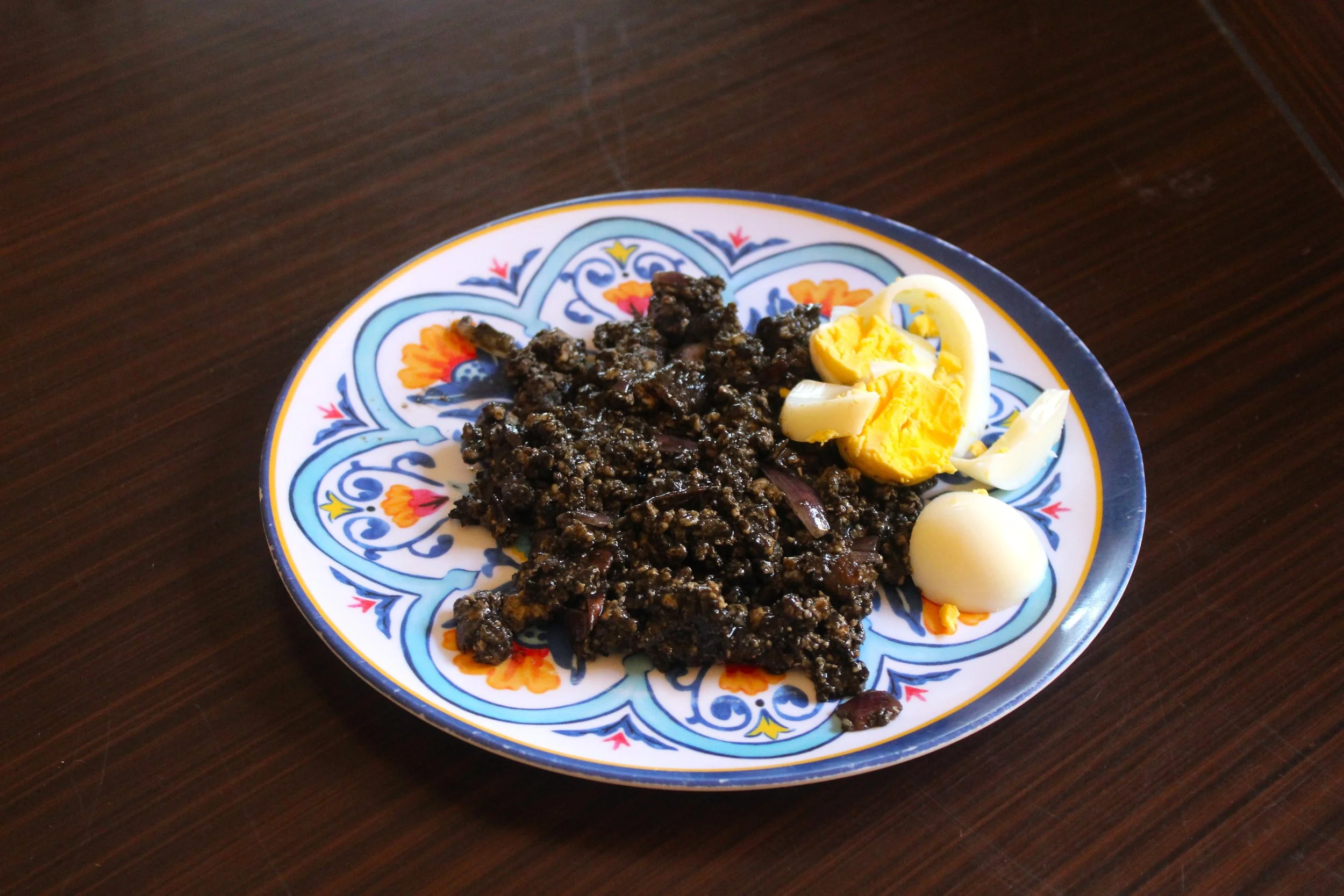 Spoon a portion of your but negro onto a plate, top with a halved boiled egg, and serve with tortillas.